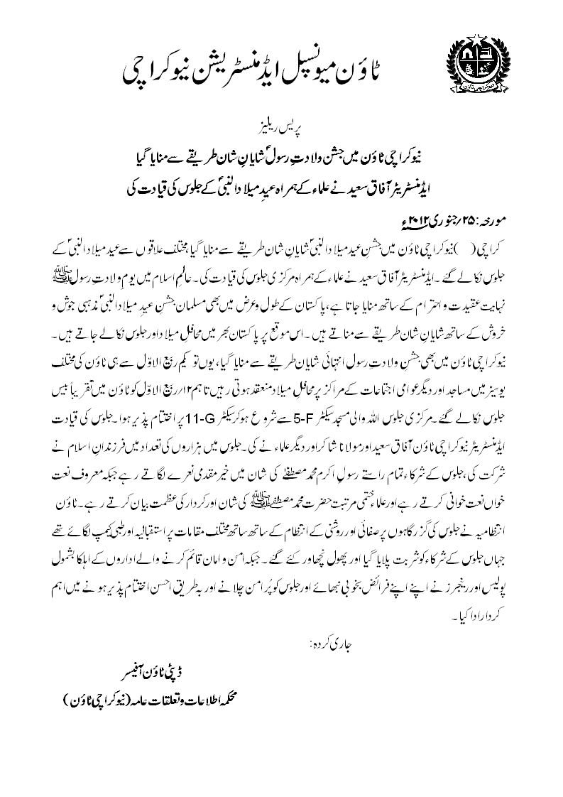 ٹاؤن ایڈمنسٹریٹر آفاق سعید نے ٹاؤن افسران کو ہدایت کی ہے کہ   ریبیع الاول کے دوران نیوکراچی ٹاؤن کو شفاف ترین ٹاؤن بنادیا جائے۔وہ نیو   کراچی ٹاؤن کے مختلف علاقوں میں جشن عیدمیلاد النبی کے حوالے سے نکلنے  والے  جلوس کی گزرگاہوں اور محفل نعت و میلاد کی اجتماعات کی جگہوں پر  صفائی کے  حوالے سے کئے گئے اقدامات کا معائنہ کر رہے تھے ۔ اس موقع پر   ٹاؤن آفیسر  انفرا اسٹرکچر اقبال احمد خان ،نازش رضا، حسام جلالی ،ندیم  حیدر ،شمعونہ  صدف اور عالمگیر سیفی بھی انکے ہمراہ تھے ۔  آفاق سعید نے  کہا کہ ماہِ  مبارک ربیع الاوّل مسلمانوں کے ہر طبقہء فکر کے لئے انتہائی  مقدس اورقابلِ  احترام ہے، اس ماہ میں رحمتِ دوعالم حضرت محمد کی ولادتِ  باسعادت ہوئی ،  اس مہینے میں تمام عالم کے مسلمان محافلِ میلادِ مصطفے  منعقد کرتے ہیں۔  نیوکراچی ٹاؤن میں بھی کئی مقامات پر مختلف تنظیموں کے  زیر اہتمام میلادِ  مصطفے  کی محفلیں منعقد کی جاتی ہیں۔اس لئے ٹاؤن کی ہر  گلی، محلے اور سڑک  کو آئینے کی طرح شفاف بنادیا جائے۔جبکہ تمام مساجد،  امام بارگاہوں اور  میلاد کی محفلوں کے لئے عوامی اجتماعات کے مقامات کے  اطراف صفائی اور روشنی  کے بہترین انتظامات کے ساتھ سیوریج لائنوں کی مرمت  کے کام بھی مکمل کرلئے  گئے ہیں ۔تاکہ میلاد کی محفلیں بہتر طور پر منعقد  کی جاسکیں۔ انہوں نے ٹاؤن  افسران کے ساتھ ساتھ رینجرز اور پولیس کے افسران  سے کہا  کہ شہر اور ملک  کی موجودہ صورتِ حال کے پیش نظرتخریب کاریاور  دہشت گردی کے امکان کو مسترد  نہیں کیا جاسکتااس لئے ٹاؤن کے ہر کونے میں  کسی بھی مشکوک چیز، تھیلے یا  شخص کی موجودگی کوایک لمحے کے لئے بھی  نظرانداز نہ کیا جائے۔ انہوں نے کہا  کے معصوم عوام کی زندگی سے کھیلنے  والے انتہائی سفاک ، دشمن اسلام اور دشمن  پاکستان ہیں۔ہمیں کسی بھی صورت  میں اپنی ذمہ زاداریوں سے غافل نہیں  رہناچاہئے۔ ہر دم چوکنا رہنا وقت کہ  اہم ضرورت ہے ۔ اس موقع پرٹاؤن افسران  نے ماہ مبارک ربیع الاول کے دوران  نیوکراچی ٹاؤن کو شفاف رکھنے میں کوئی  کسر نہ اُٹھارکھنے کا یقین دلایا،  جبکہ رینجرز اور پولیس افسران کی جانب سے  نیوکراچی ٹاؤن میں جلوس کی گزر  گاہوں اور محفل نعت   کے لئے کئے جانے والے  انتظامات کا بھی جائزہ لیا ۔