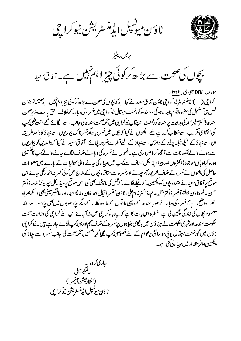 Administrator New Karachi Town Afaq Saeed inspection the measles camp in Sindh Govt Hospital New Karachi.