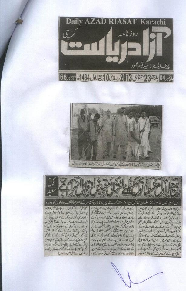 ٹاؤن ایڈمنسٹریٹر آفاق سعید نے ٹاؤن افسران کو ہدایت کی ہے کہ ریبیع الاول کے دوران نیوکراچی ٹاؤن کو شفاف ترین ٹاؤن بنادیا جائے۔وہ نیو کراچی ٹاؤن کے مختلف علاقوں میں جشن عیدمیلاد النبی کے حوالے سے نکلنے والے جلوس کی گزرگاہوں اور محفل نعت و میلاد کی اجتماعات کی جگہوں پر صفائی کے حوالے سے کئے گئے اقدامات کا معائنہ کر رہے تھے ۔ اس موقع پر ٹاؤن آفیسر انفرا اسٹرکچر اقبال احمد خان ،نازش رضا، حسام جلالی ،ندیم حیدر ،شمعونہ صدف اور عالمگیر سیفی بھی انکے ہمراہ تھے ۔ آفاق سعید نے کہا کہ ماہِ مبارک ربیع الاوّل مسلمانوں کے ہر طبقہء فکر کے لئے انتہائی مقدس اورقابلِ احترام ہے، اس ماہ میں رحمتِ دوعالم حضرت محمد کی ولادتِ باسعادت ہوئی ، اس مہینے میں تمام عالم کے مسلمان محافلِ میلادِ مصطفے منعقد کرتے ہیں۔ نیوکراچی ٹاؤن میں بھی کئی مقامات پر مختلف تنظیموں کے زیر اہتمام میلادِ مصطفے کی محفلیں منعقد کی جاتی ہیں۔اس لئے ٹاؤن کی ہر گلی، محلے اور سڑک کو آئینے کی طرح شفاف بنادیا جائے۔جبکہ تمام مساجد، امام بارگاہوں اور میلاد کی محفلوں کے لئے عوامی اجتماعات کے مقامات کے اطراف صفائی اور روشنی کے بہترین انتظامات کے ساتھ سیوریج لائنوں کی مرمت کے کام بھی مکمل کرلئے گئے ہیں ۔تاکہ میلاد کی محفلیں بہتر طور پر منعقد کی جاسکیں۔ انہوں نے ٹاؤن افسران کے ساتھ ساتھ رینجرز اور پولیس کے افسران سے کہا کہ شہر اور ملک کی موجودہ صورتِ حال کے پیش نظرتخریب کاریاور دہشت گردی کے امکان کو مسترد نہیں کیا جاسکتااس لئے ٹاؤن کے ہر کونے میں کسی بھی مشکوک چیز، تھیلے یا شخص کی موجودگی کوایک لمحے کے لئے بھی نظرانداز نہ کیا جائے۔ انہوں نے کہا کے معصوم عوام کی زندگی سے کھیلنے والے انتہائی سفاک ، دشمن اسلام اور دشمن پاکستان ہیں۔ہمیں کسی بھی صورت میں اپنی ذمہ زاداریوں سے غافل نہیں رہناچاہئے۔ ہر دم چوکنا رہنا وقت کہ اہم ضرورت ہے ۔ اس موقع پرٹاؤن افسران نے ماہ مبارک ربیع الاول کے دوران نیوکراچی ٹاؤن کو شفاف رکھنے میں کوئی کسر نہ اُٹھارکھنے کا یقین دلایا، جبکہ رینجرز اور پولیس افسران کی جانب سے نیوکراچی ٹاؤن میں جلوس کی گزر گاہوں اور محفل نعت کے لئے کئے جانے والے انتظامات کا بھی جائزہ لیا ۔